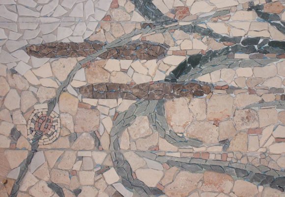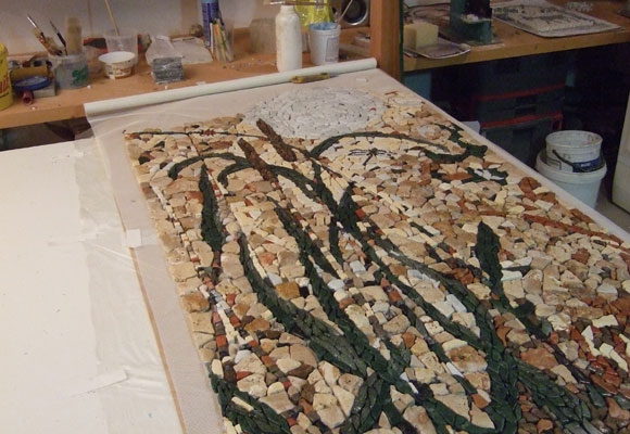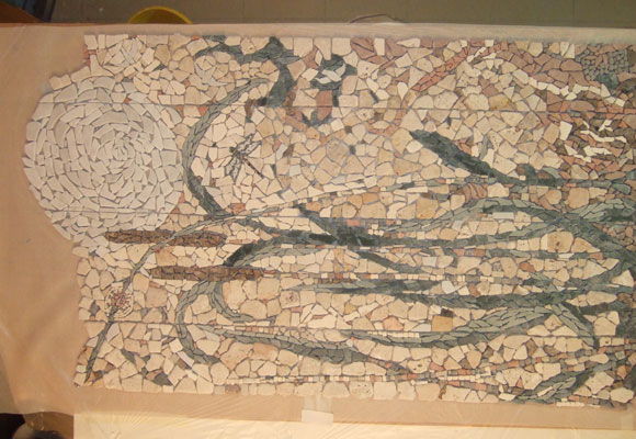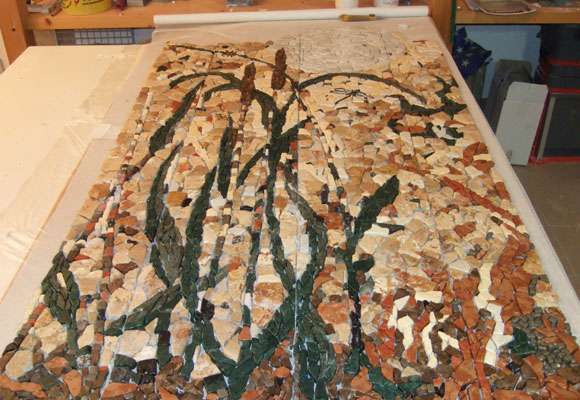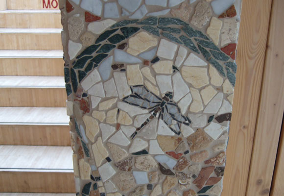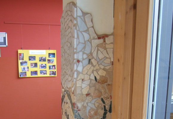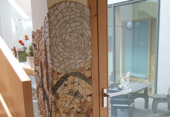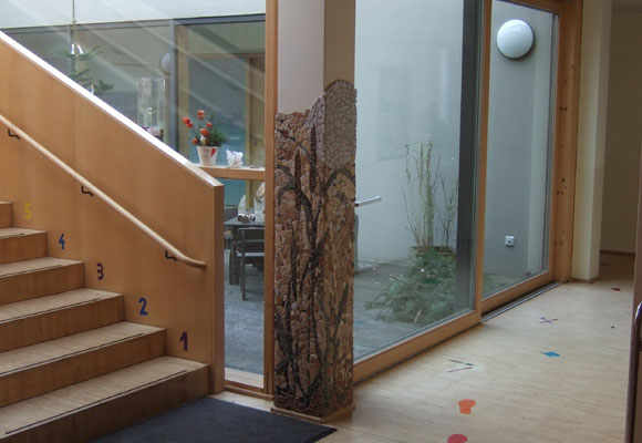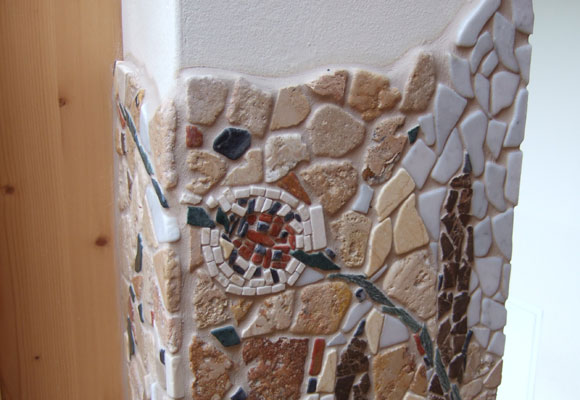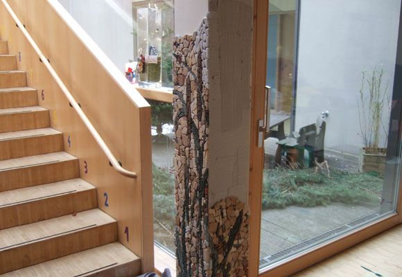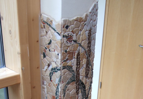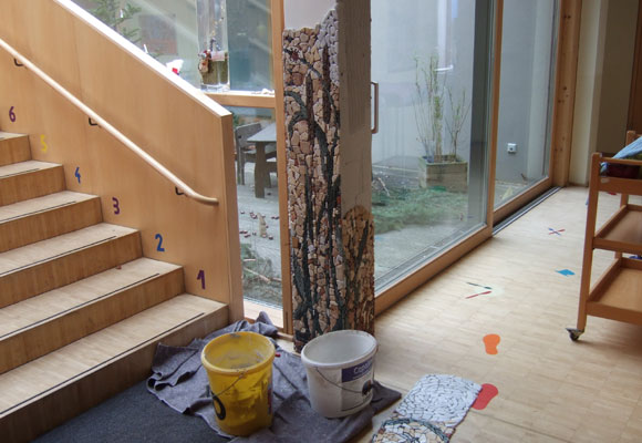 In dieser Kita wurde der stark frequentierte Fingerbereich dieser Säule mit einer Mosaikarbeit verziert. (des Malers Pinsel hat nun Ruh) Das Mosaik wurde in der Werkstatt vorgefertigt und danach in wenigen Stunden versetzt.