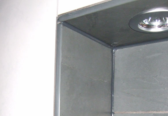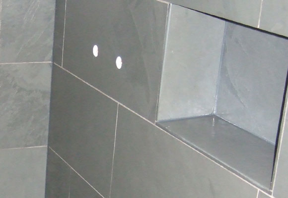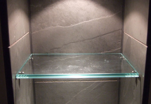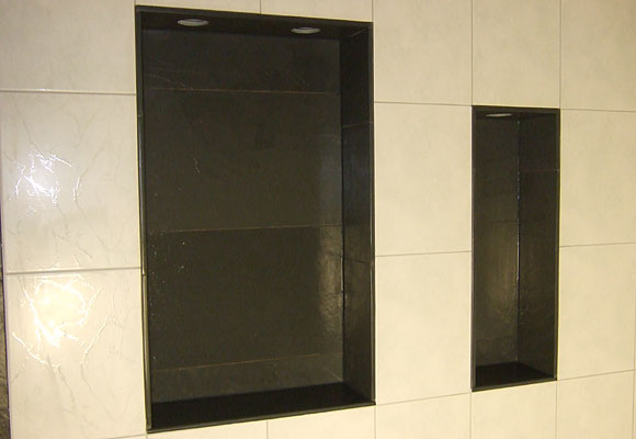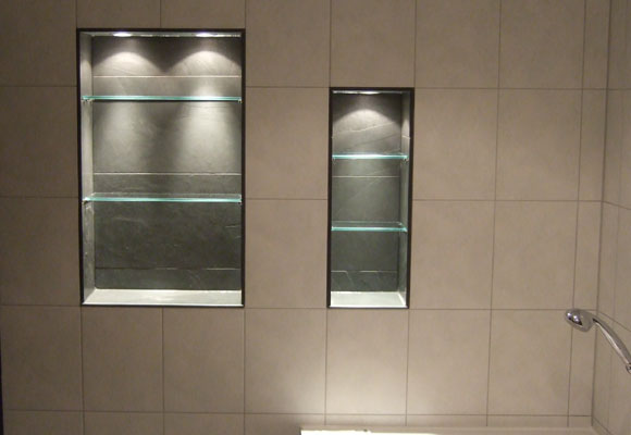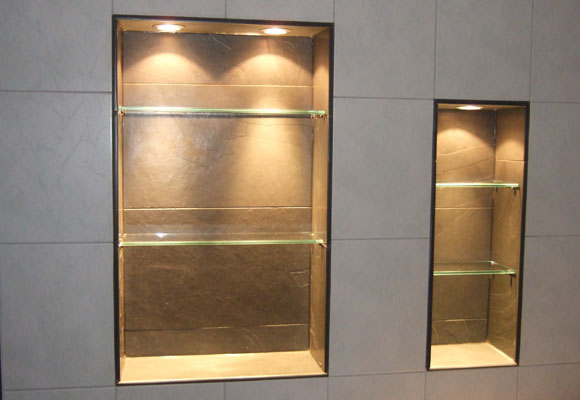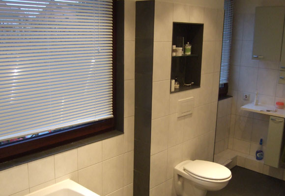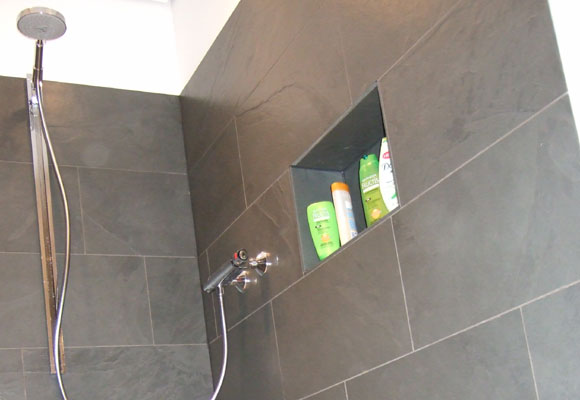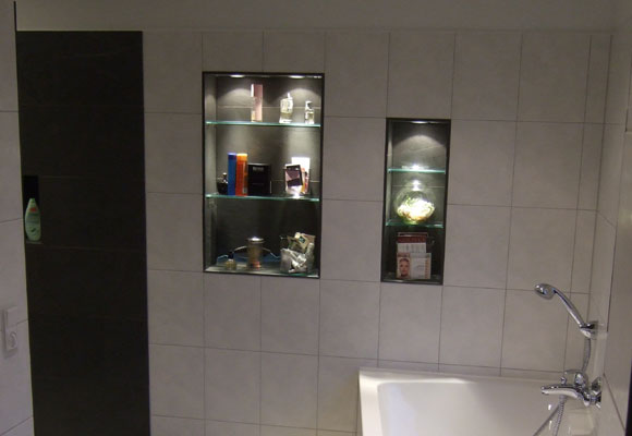 In Trockenbauwände wurden Nischen geschaffen für Wohnaccessoires das ersetzt teure Badmöbel.
